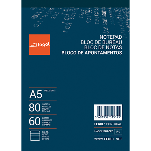 Formato: A5Interior: PautadoGramagem: 60grNº Folhas: 80Quantidade: Embalagem com 10Outbox: 80- Bloco colado no topo com 80 folhas em papel branco de 60 grs- Sem furação e microperfuradas para serem facilmente destacadas- Disponível em papel pautado, xadrez e liso, nos formatos A4, A5, A6 e A7