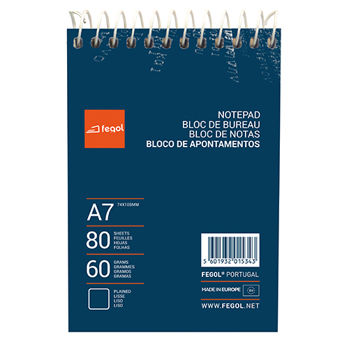• BLOCO APONTAMENTOS A7 FEGOL ESPIRAL 80FOLHAS LISO