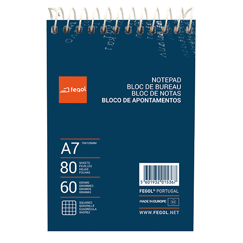 • Formato: A7• Interior: Xadrez• Gramagem: 60gr• Nº Folhas: 80• Quantidade: Embalagem com 10- Bloco colado no topo com 80 folhas em papel branco de 60 grs- Sem furação e microperfuradas para serem facilmente destacadas- Disponível em papel pautado, xadrez e liso, nos formatos A4, A5, A6 e A7