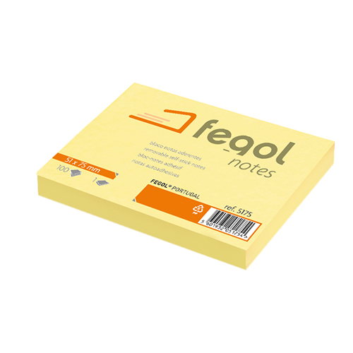 Ref. Fornecedor: 5175Medida: 51x75mmMarca: FegolCor: AmareloNº de Folhas: 100Apresentação: Embalagem com 12 blocosOutbox: 432- Bloco de 100 folhas amarelas com adesivo na parte superior- Colam e descolam sobre qualquer superficie sem danificar o documento original- A cor amarelo canário realça e torna os seus apontamentos facilmente visíveis- Disponível em várias medidas