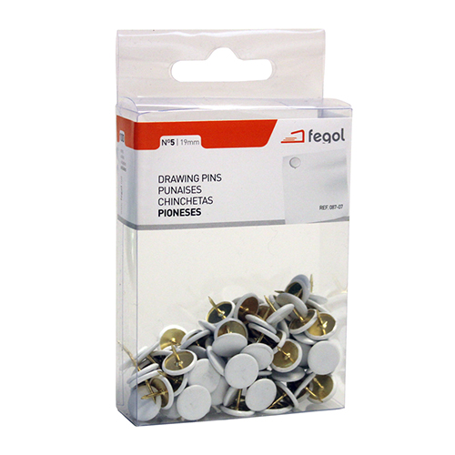 Ref. Fabricante: 087-07Cor: BrancoMaterial: FerroAcabamento: LatonadoApresentação: Blister em plástico com 100 pionesesQuantidade: Embalagem com 12Outbox: 144- Pioneses cravados em latão- Com cabeça redonda revestida a PVC colorido- Disponível em blister de 100 pioneses em cores sortidas ou brancas
