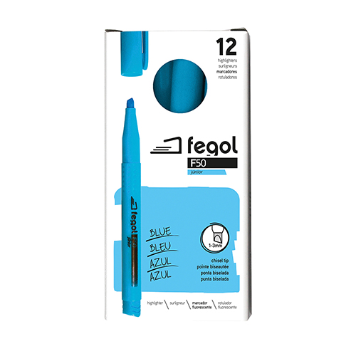 Marca: FegolReferência: CX12-F50AZPonta: BiseladaCor: Azul-Marcador com ponta de fibra biselada, duas espessuras de traço.-Graças ao seu corpo fino e redondo permite um uso bastante prático no uso escolar.-Tinta fluorescente universal à base de água de alta luminosidade.-Tampa ventilada.-Corpo em PP, opaco, fino, cuja cor indica a tonalidade da escrita.-Disponível nas cores Azul, Verde, Amarelo, Laranja e Rosa.