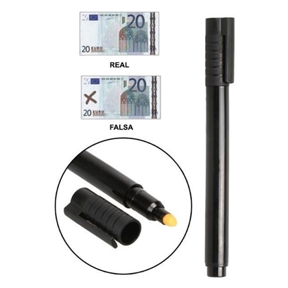 - A caneta detectora de notas falsas usa uma fórmula química que testa a composição do papel de algodão presente nas notas. - Basta passar com a caneta, se ficar amarelo ou transparente a nota é verdadeira, se ficar preto ou castanho a nota é suspeita. - Funciona com a maioria das divisas mundiais.
