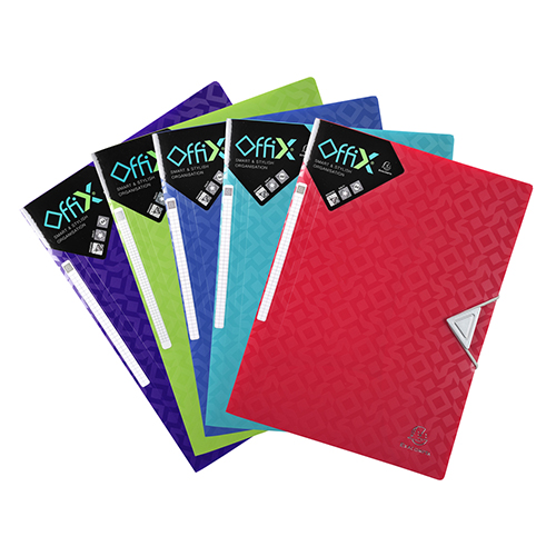 Marca: ExacomptaModelo: OffiXMaterial: PPCor: SortidoTamanho: A4Cores Sortidas: Azul, Roxo, Vermelho, Turquesa, VerdeApresentação: Capa com 3 abas e elásticosCapacidade : 200fls (80g)Peso: 98gCaracterísticas: Etiqueta na lombada