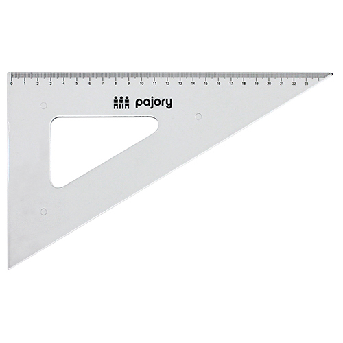 Ref: Fornecedor: 10-26Graduação: 60ºHipotenusa: 26cmCor: Cristal Transparente- Esquadro em poliestireno transparente com graduação lateral(apenas em 1 dos lados)- Arestas biseladas e plástico cristalino de boa qualidade- Espessura de 2-2,5mm e escala de 1mm