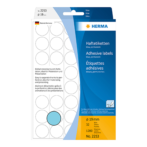 • Referência : 2253• Formato : A5• Medidas : Redondas 19mm• Nº de Etiquetas : 1280 (40 por folha)• Cor : Azul• Unidade mínima de venda : 1 Carteira• Unidades por embalagem : 10 Carteiras