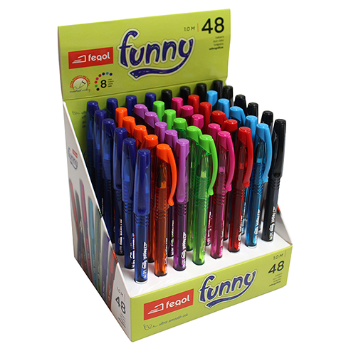 Quantidade: Expositor com 48 esferográficas-Esferográfica de tinta ultra suave, para uma escrita rápida.-A sua fluidez torna a escrita sem esforço.-De secagem rápida, disponível em 8 cores de escrita, que revolucionará o seu dia-a-dia.-Na forma redonda, tampa com clip em cores translúcidas.