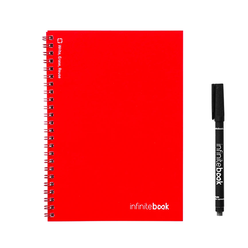 • Ref • 102VM• Modelo • Classic• Formato • A5• Nº Folhas • 15 folhas + capa e contra-capa• Interior • Liso• Cor • Vermelho• Conteúdo do kit • Bloco notas + Marcador preto escrita fina• Perguntas frequentes •- Que tipo de marcadores posso utilizar?Nós recomendamos apenas os Staedtler Lumocolor Correctable pretos e vermelhos.- Outras cores podem manchar o infinitebook.Marcadores de quadro branco (dry erase) podem também manchar o infinitebook.- O Infinitebook fica manchado?A tinta do marcador fornecido seca em cerca de 6 segundos.Depois desse tempo, podes colocar a mão por cima da tinta ou mesmo fechar o caderno sem que fique manchado.Para prevenir pequenas manchas não-permanentes quando apagas o caderno, espera cerca de 6 segundos.(O tempo de espera depende da humidade do ar e temperatura ambiente)- Como passo apagar o meu infinitebook?Podes apagar o texto do infinitebook utilizando a borracha do marcador ou para melhores resultados, um pano húmido.Se a tinta estiver no infinitebook mais de um mês, recomendamos a utilização do kit de limpeza (Vem com um pano de microfibras, um spray para encher com água e uma esponja)