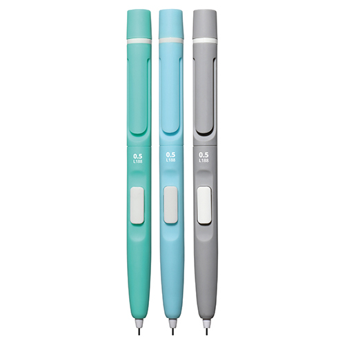 Lapiseiras recarregáveis com borracha incorporada e clip, botão de pressão lateral side click para um avanço de mina sem interromper a escrita. azul claro, cinza claro, verde claro