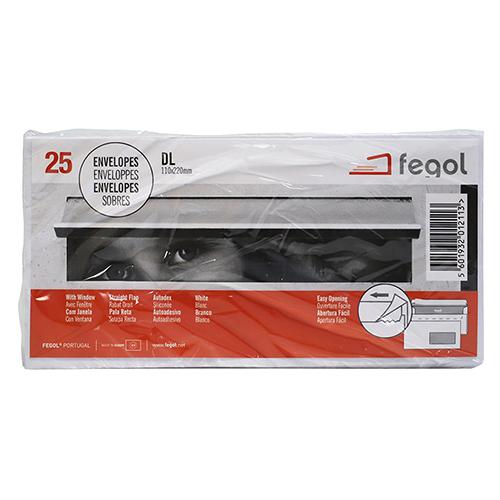 Ref. Fabricante: 01211Modelo: DLMedida: 110x220mmTipo: Com JanelaPala: AdesivaApresentação: Blister de 25 envelopesQuantidade: Caixa com 20 blistersGramagem: Papel de 90grCor: Branco- Envelopes em papel liso, fundo impresso- Autoadesivos, em papel brancos- Disponível em embalagens de 25 ou caixa de 500 envelopes
