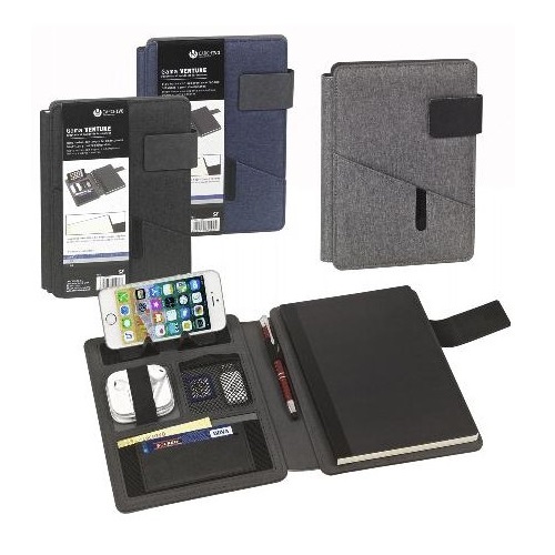 Referência 23015008Modelo: VentureFormato: A5Cor: Cinza EscuroPasta de documentos A5 Venture denim a cores. Suporte para Smartphone.Laço de fecho magnético oculto.