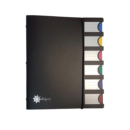 Referência • 40705Modelo • Com divisóriasMedidas • A4Cor • PretoPasta de documentos com 6 divisórias internas.Inclui 6 separadores de cores sortidas.Com argolas para bolsas destacáveis.