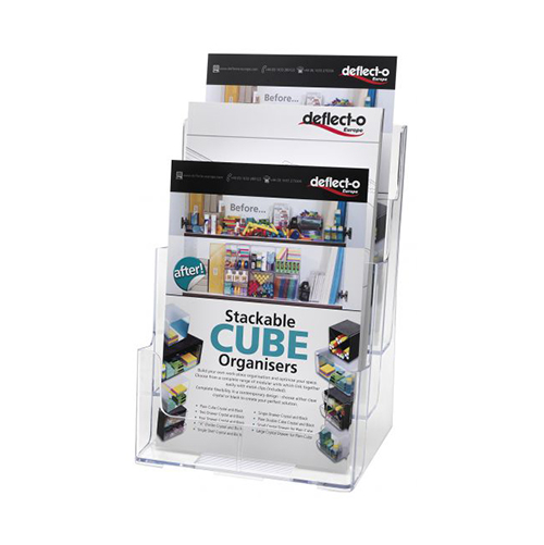 Ref. Fabricante: DE77301 CS TPFormato: A4 vertical com 3 divisóriasCor: TransparentePorta folhetos de balcão e parede.Opção de montagem sob a parede.Ideal para colocar folletos e/ou boletins de informação.