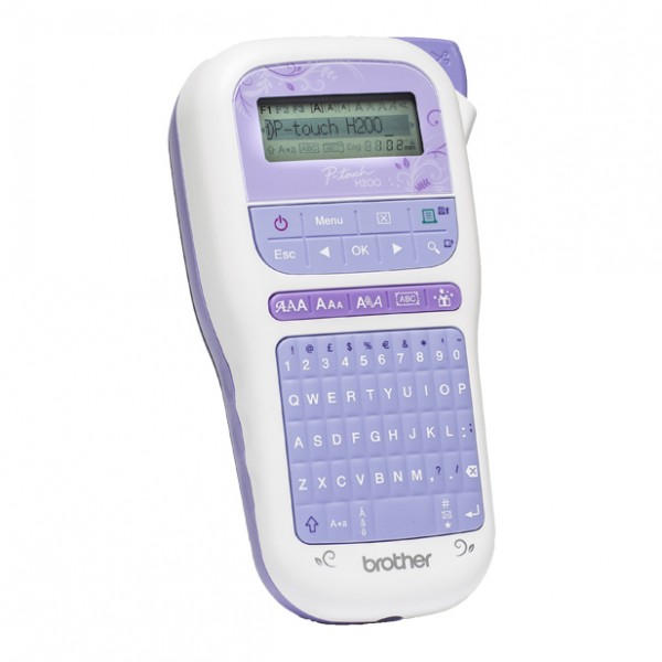 Rotuladora eletrónica de mão com design ergonómico para casa ou para trabalhos manuais com teclado QWERTY. Cor lavanda e branco.