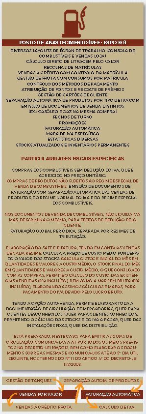 Emissão de documentos de faturação com separação automática das vendas de produtos, do regime normal do IVA e do regime especial dos combustíveis.